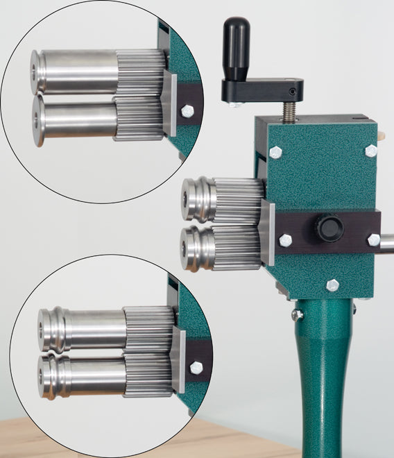 Our Crimper/Beader machine will provide you with single pass crimping and beading. It also allows fade away crimping by simply adjusting the knurled wheel, no tools required. By removing the ogee bead dies you can do crimping only or add auxiliary dies such as deep throat ogee bead dies or our 1/4" bead dies which will allow you to have a 4-1/2" throat depth.