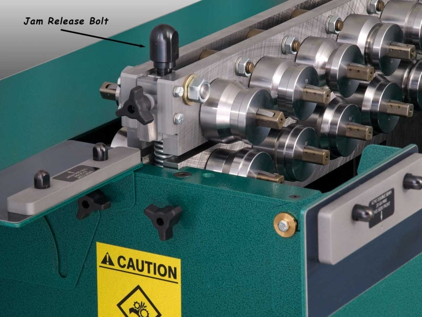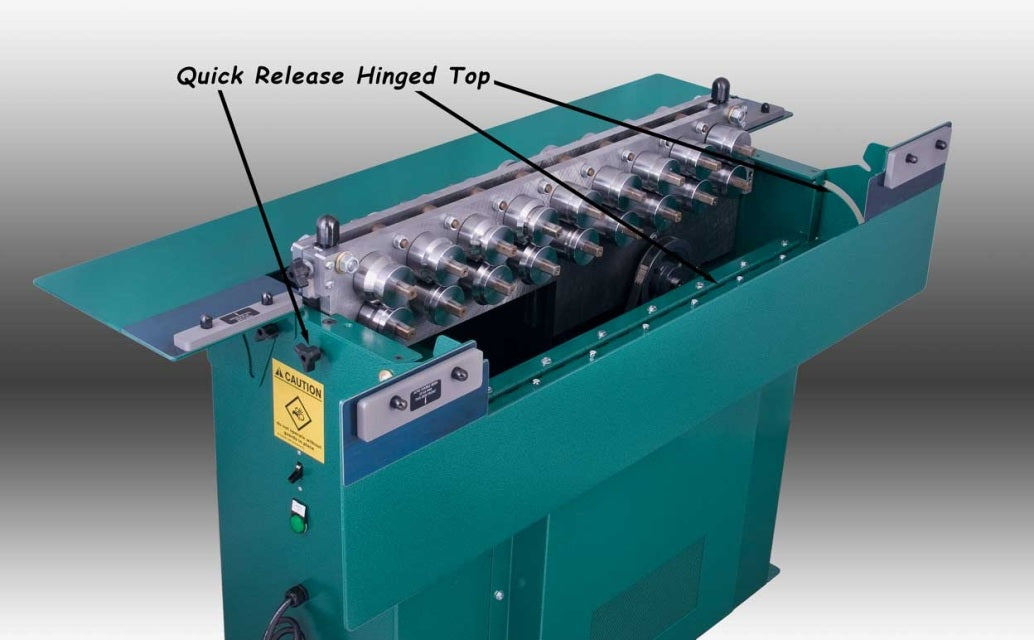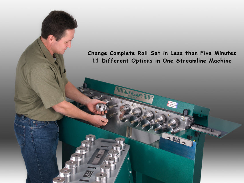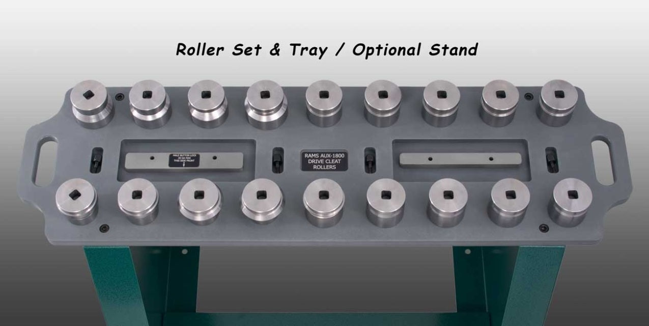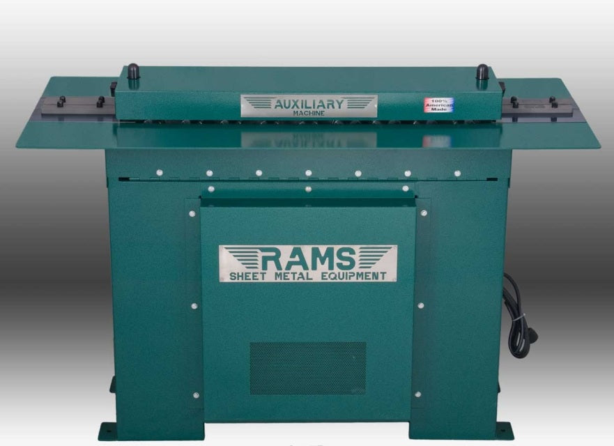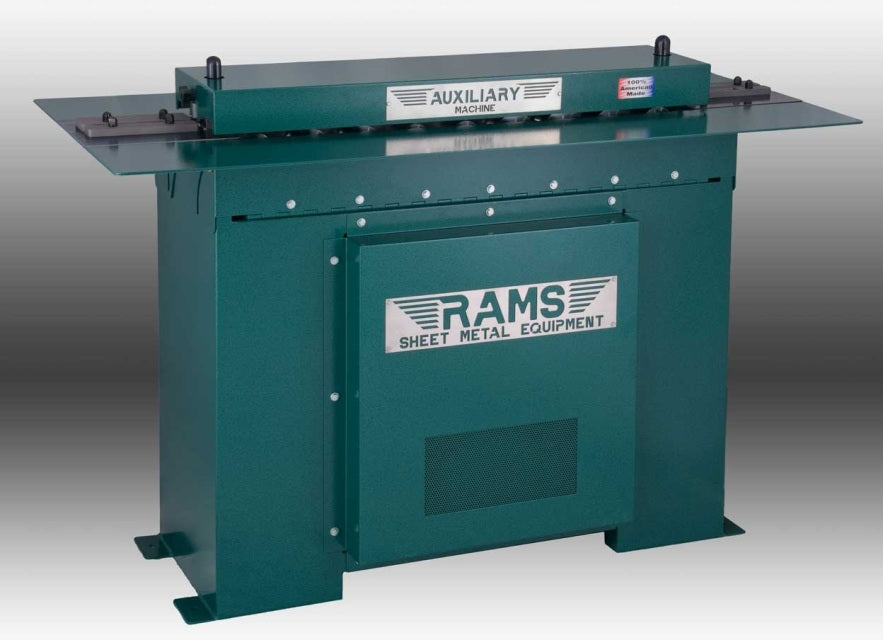 The RAMS 2014 Auxiliary Machine is like no other machine available on the market today. Features a 5 HP motor 208-230V single phase. It was designed specifically for ease of use, flexibility and the convenience of the end user. Key features include: hinged table top and square drive shafts which allows easy access to change out a complete roll set in less than five minutes, quick change tooling which requires no keys or tools, and quick jam clearing. This machine can convert from a button lock to an Acme & Drive Cleat machine instantly. Please see slide show for more details.