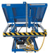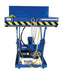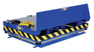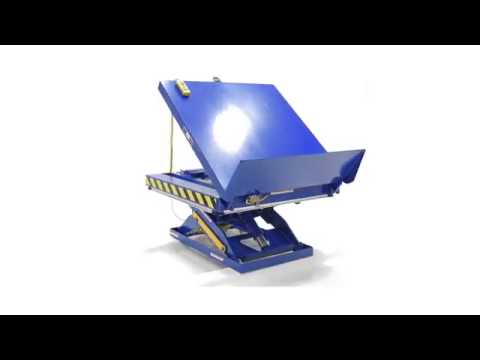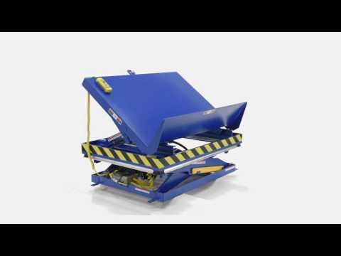 Performs both lifting and tilting operations. 45 degree and 90 degree tilt available. Restraining chain and 12" high lip keep load in place during tilting. Safety features include: electric toe guard to shield worker from pinch points during lowering of table, safety velocity fuses to stop travel due to loss of hydraulic pressure, 4 push-button hand pendent control on an 8 foot coil cord, upper limit switch to stop travel at maximum height reducing motor wear and maintenance prop. End tilt standard, side tilt available. Optional accordion skirting available for both the lifting and tilting portions of the table, contact factory.